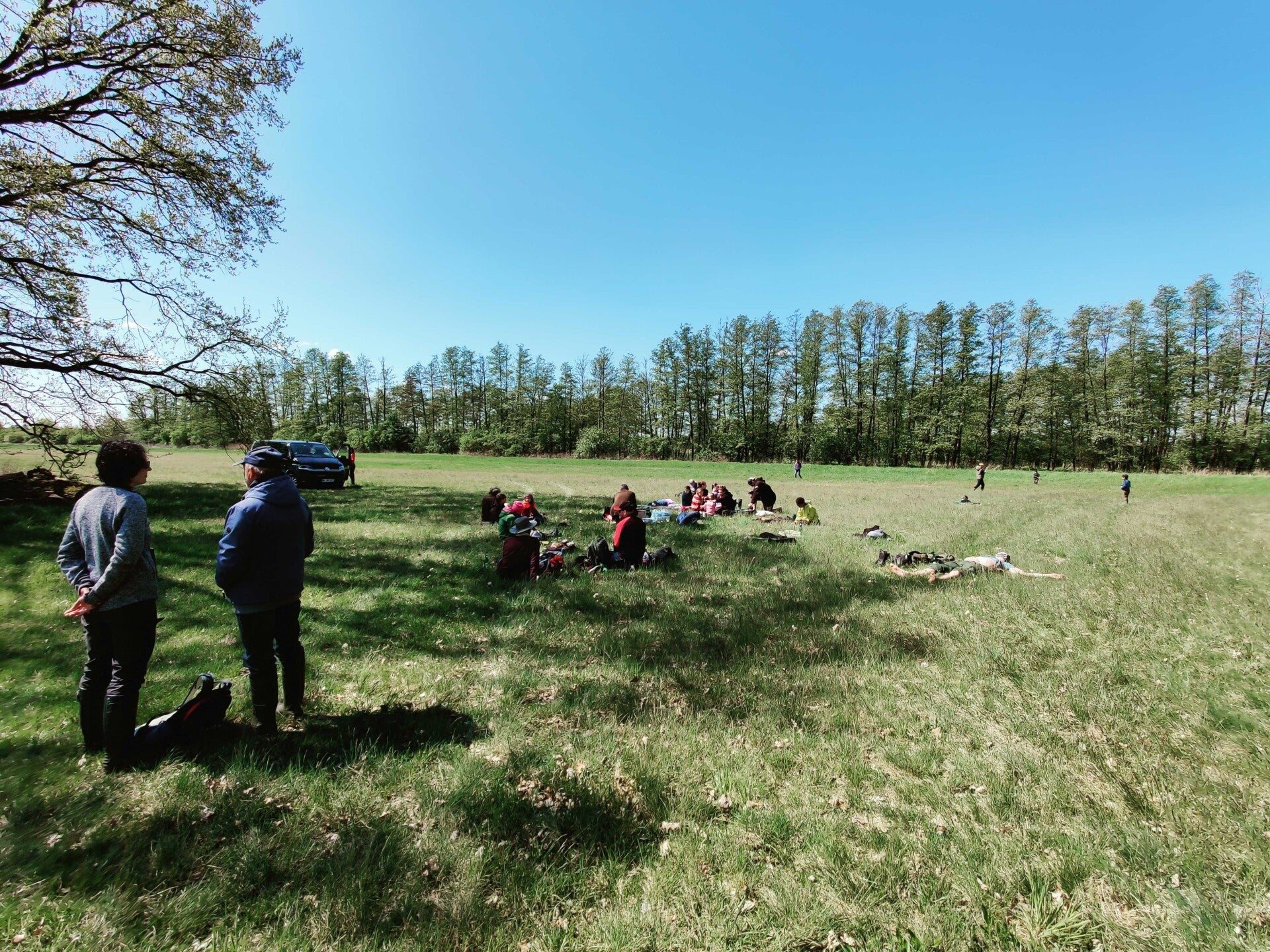 Der erste Halt wurde an einer Wiese gemacht, um an ihrem mit Besenginster bestandenen Rand nach Reptilien zu suchen. Dabei durften alle mal eine als künstliches Versteck vorher ausgebrachte Platte umdrehen, in der Hoffnung eine Eidechse darunter zu erspähen. An einem Zaunpfahl wurden sie fündig. Jedes Kind konnte nun einmal ein erwachsenes Zauneidechsenmännchen bestaunen. Direkt daneben an einem kleinen Wiesenweiher wurden danach die Fallen aus dem Wasser gezogen, die am Abend zuvor dort versteckt wurden. Kamm- & Teichmolche, junge Teichfrösche, Wasserwanzen, Libellenlarven und Wasserkäfer konnten daraus geborgen werden. Wir hatten dabei die Gelegenheit, die Merkmale mit welchen sich Molche und Frösche erkennen lassen, anzusehen und damit zu festigen, was am Abend zuvor gelernt wurde. Weiter ging es über Feldwege und Wiesen des Biosphärenreservats, vorbei an Gräben und Hecken, bis zu den großen Eichen. Auf dieser Wiese angekommen, durften sich alle über ihre Brotbüchsen, die Obstnetzte und die Kekspackungen hermachen. Auf einem langen und schönen Weg zu kleinen Tümpeln und Teichen gelangte die Wandergesellschaft am Nachmittag zurück auf den Zeltplatz nach Mieste. Nun gab es ausreichend Zeit für Spielen, Bestimmungsübungen und die Gelegenheit, fast alle heimischen Reptilien und Amphibien einmal in echt zu sehen. Wer es sich traute, nahm die Tiere sogar auf die Hand!