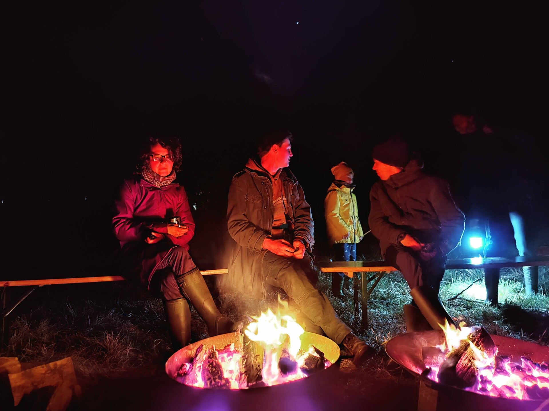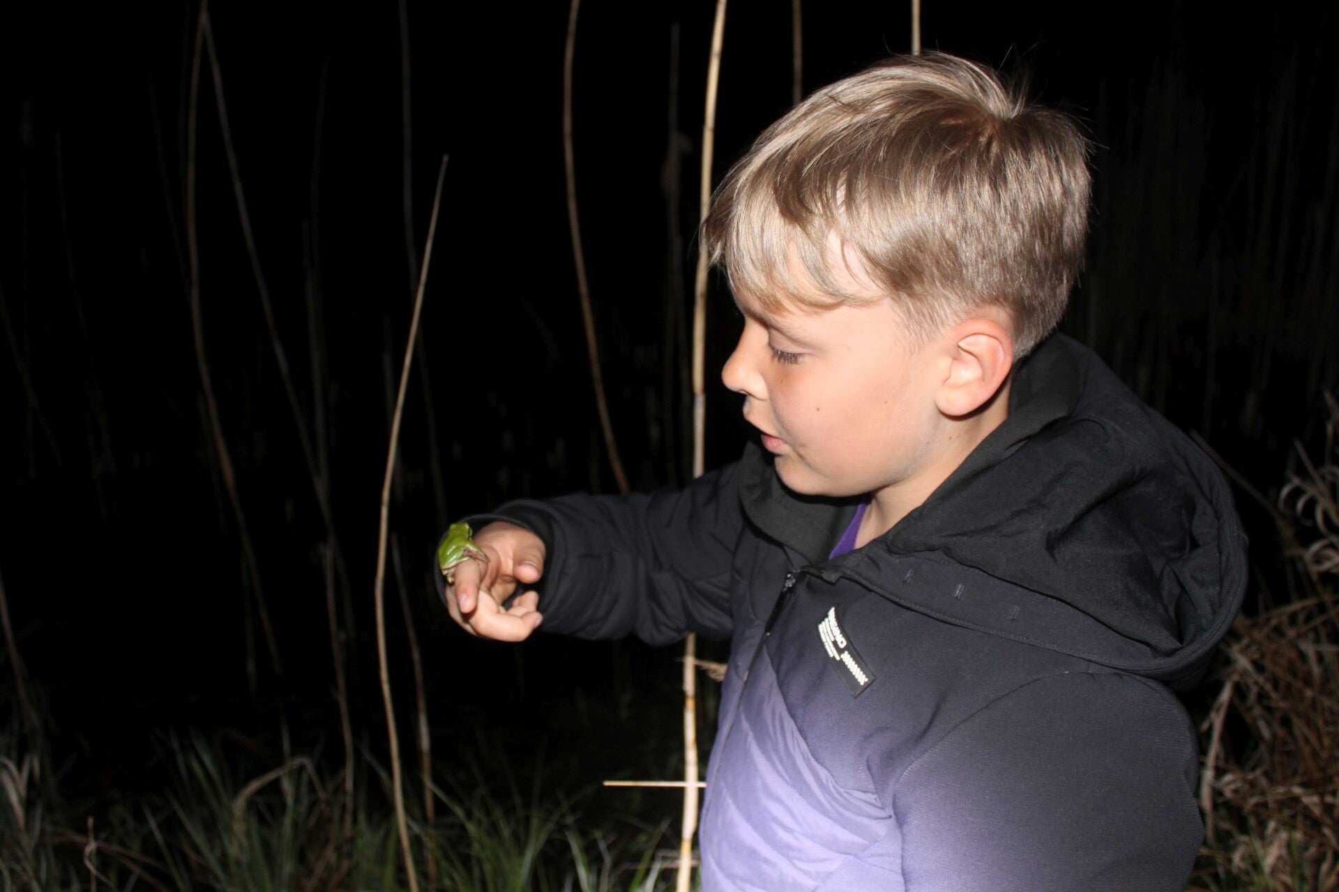 Nachdem die Sonne den Horizont wieder berührte und die Frösche langsam wach wurden, unternahm die Gruppe eine Nachtwanderung. Das ohrenbetäubende Rattern der Laubfrösche war schon aus hunderten Metern Entfernung zu hören. Mit der Technik, die hohlen Hände an die Ohren zu halten und den Kopf langsam zu drehen wurde der Standort des Froschkonzerts schnell ausgemacht und angelaufen. Einen Laubfrosch zu sehen, geschweige denn zu fangen war eine schwere Aufgabe für alle Anwesenden, dennoch gelang es. Ein schöner Ausklang für einen ereignisreichen Tag!